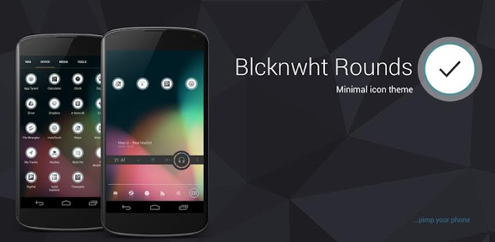 Overview: Black'n'white stock icons, BlcknwhtRounds APK 1.0 for android application with a glass circle behind them and a thin jelly bean blue outline..